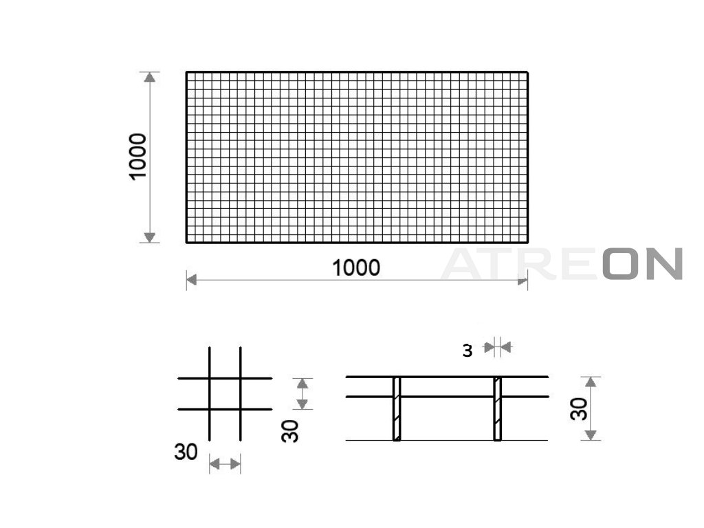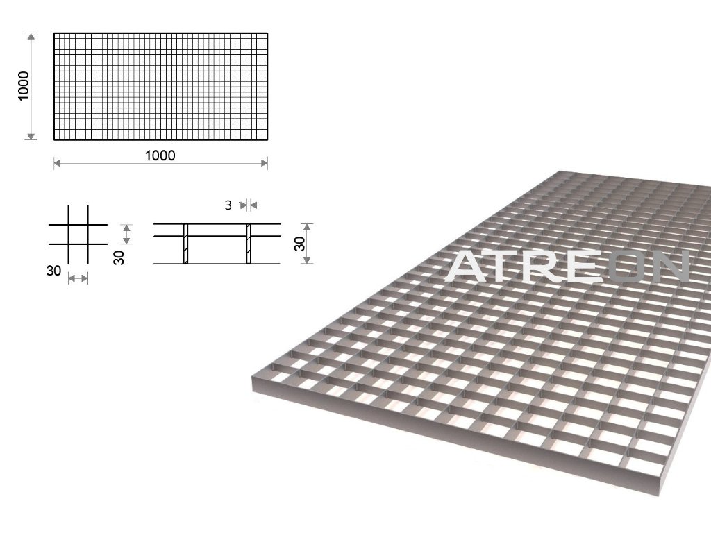 Pozinkovaný rošt lisovaný 1000x1000 mm, oko 30x30 mm, tlustší nosná páska 30x3 mm