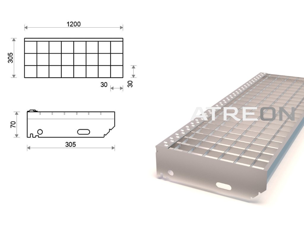 Pozinkovaný schodiskový stupeň lisovaný 1200x305 mm, oko 30x30 mm
