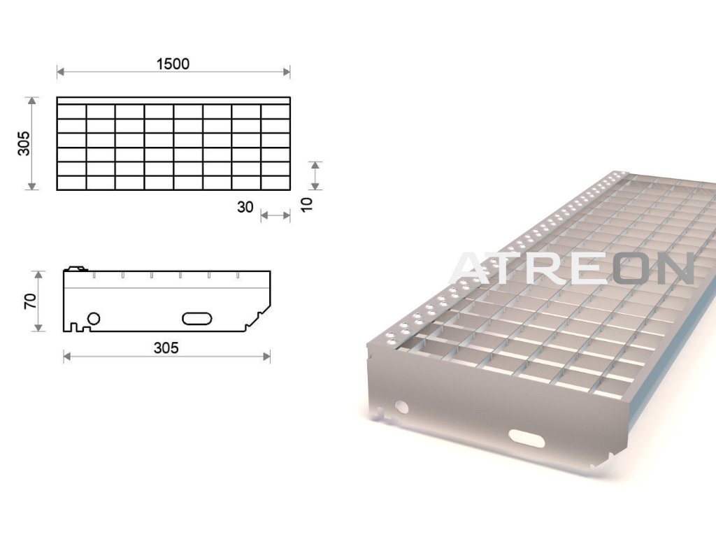 Pozinkovaný schodiskový stupeň lisovaný 1500x305 mm, oko 30x10 mm