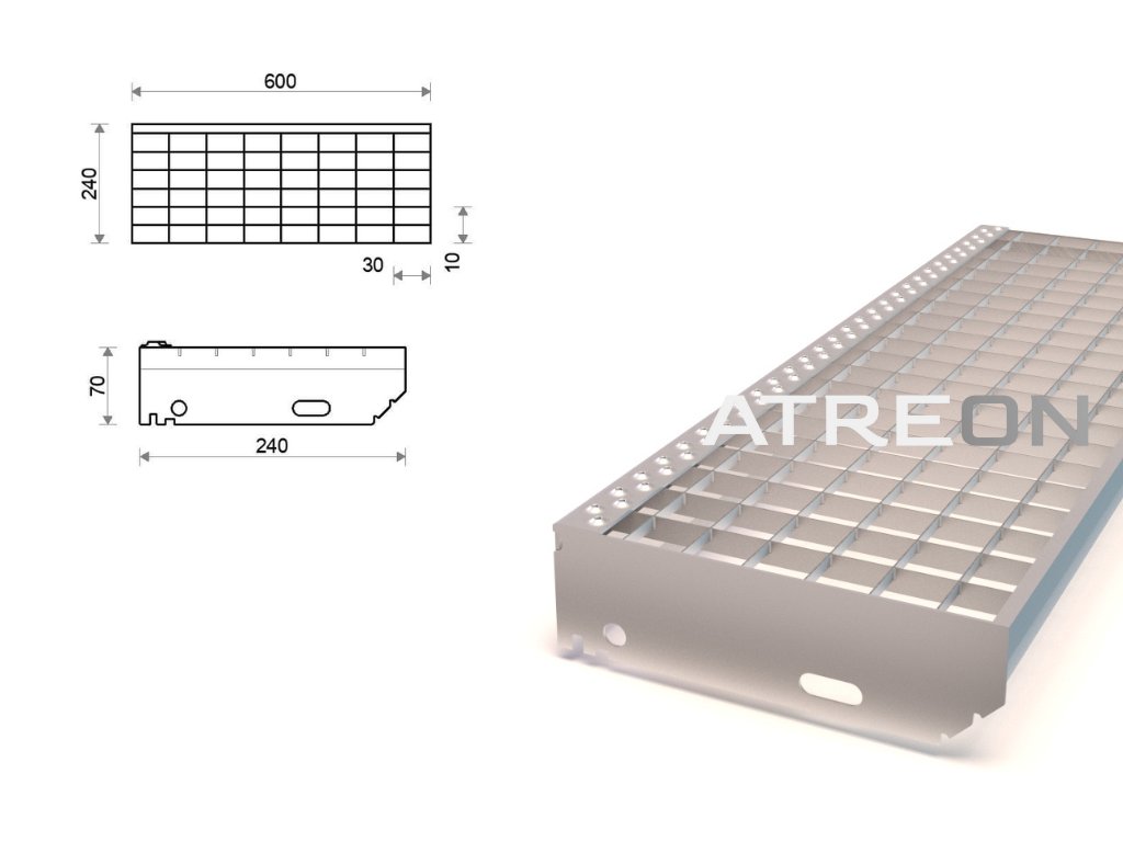 Schodiskový stupeň lisovaný 600x240 mm, oko 30x10 mm je vysoko kvalitný produkt určený na použitie na schodiskách a ďalších podobných aplikáciách, kde je potrebné zaistiť bezpečný a stabilný prístup. Ide o žiarovo pozinkovaný materiál, ktorý zabezpečuje odolnosť proti korózii a dlhú životnosť. Tento oceľový stupeň (nášľapná plocha) je ideálny pre vonkajšie prostredie, či už ide o priemyselné objekty, skladové priestory, komerčné budovy alebo rodinné domy. Schodiskový stupeň má dĺžku 600 mm a šírku 240 mm, čo zaisťuje dostatočný priestor na pohodlný a bezpečný krok. Otvory s rozmermi 30x10 mm poskytujú nielen požadovanú protišmykovosť, ale aj umožňujú efektívne odvodnenie, čo je dôležité najmä pre vonkajšie aplikácie. Oceľová schodnica je vyrobená z kvalitného oceľového materiálu, čo jej dodáva vynikajúcu pevnosť a dlhú životnosť. Je ideálnou voľbou pre miesta, kde je potrebná odolnosť voči mechanickému poškodeniu a poveternostným vplyvom. Pre maximálnu funkčnosť a estetiku odporúčame kombinovať tieto stupne s pororoštami (oceľovými roštmi), vďaka čomu získate kvalitné a praktické schodisko, ktoré je ideálne pre náročné prostredie, vrátane vonkajších a priemyselných oblastí. Hmotnosť produktu je 3,6 kg.