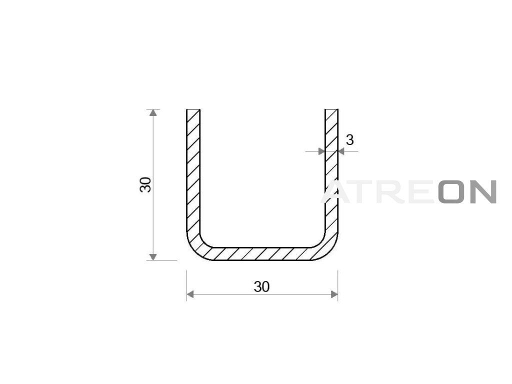 U profil 30x30x30x3 je otvorený štvorcový jekel tvaru U v akosti S235 valcovaný za studena so zaručenou zvárateľnosťou. Tento štvorcový jekel je ohýbaný so zaoblenými hranami. Využitie nachádza najmä v stavebníctve a zámočníckej činnosti. U profil 30×30 s hrúbkou 3 mm sa dodáva vo výrobnej dĺžke 6 m s hmotnosťou 11,7 kg, výškou 30 mm a šírkou profilu (základne) 30 mm. Hmotnosť produktu na 1 m je 1,95 kg.